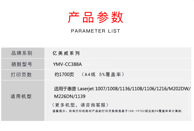 億美威 YMV-CC388A 惠普 Laserjet 1007/1008/1136/1108/1106/1216 全國(guó)統(tǒng)一價(jià):178元