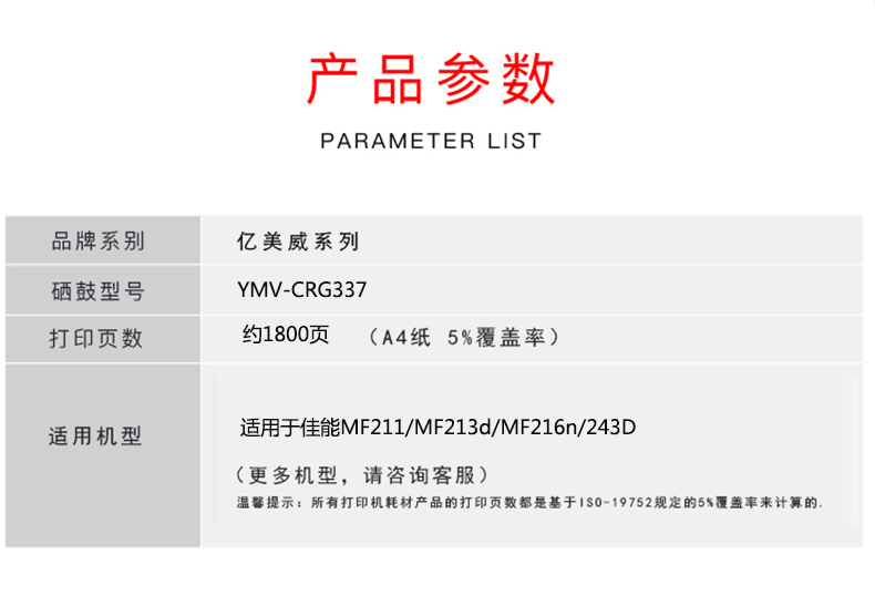 億美威 YMV-CRG337 適用于佳能MF211/MF213D/MF216/243D 全國統(tǒng)一價(jià):178元